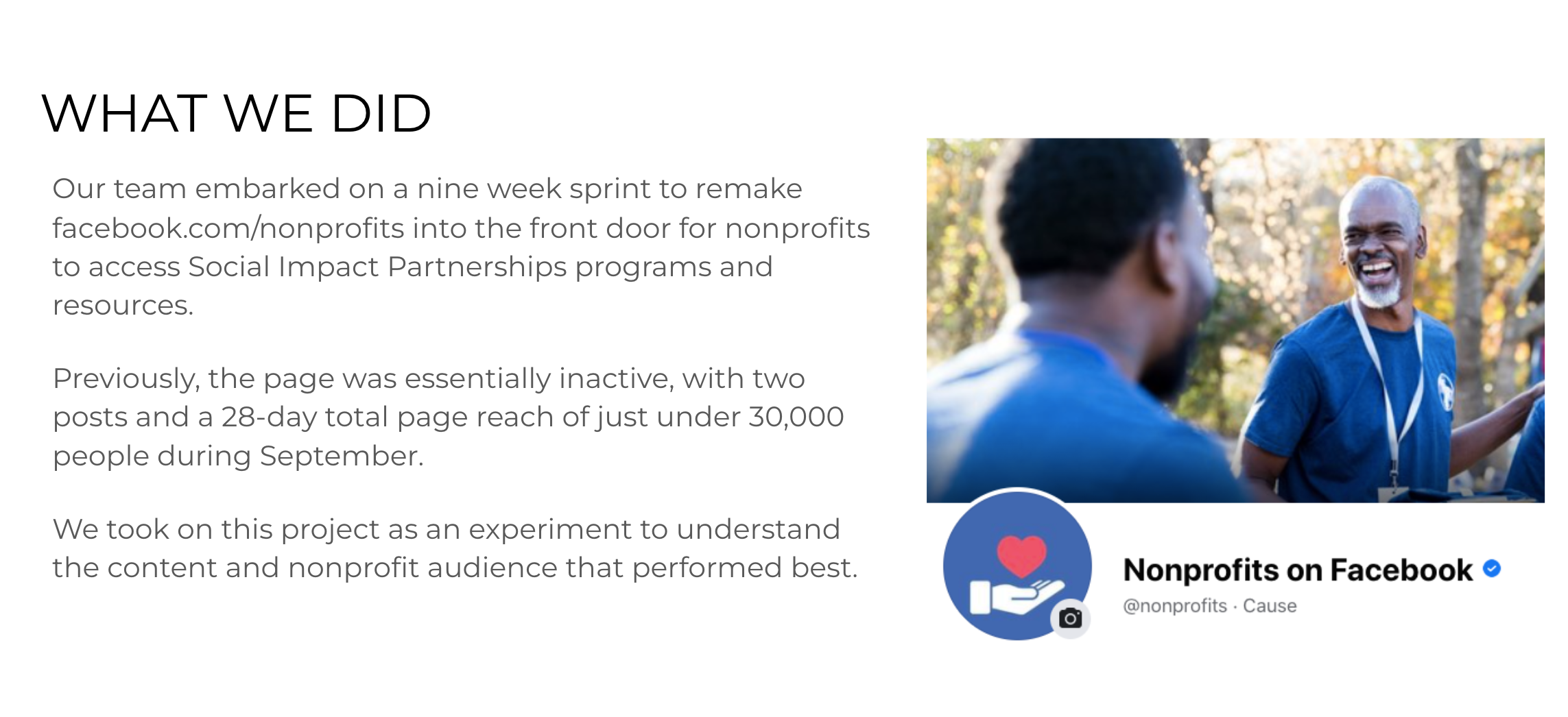 Examples of work from my time at Meta, or Facebook as it was then called. As a marketing and creative lead for the Partnerships Marketing department, a division of Facebook’s Global Business Marketing unit, I led a team of 11 full-time contingent workers that provided graphic design, web design, web development, copywriting, content creation, social media and marketing strategy for nonprofits and non-governmental organizations.